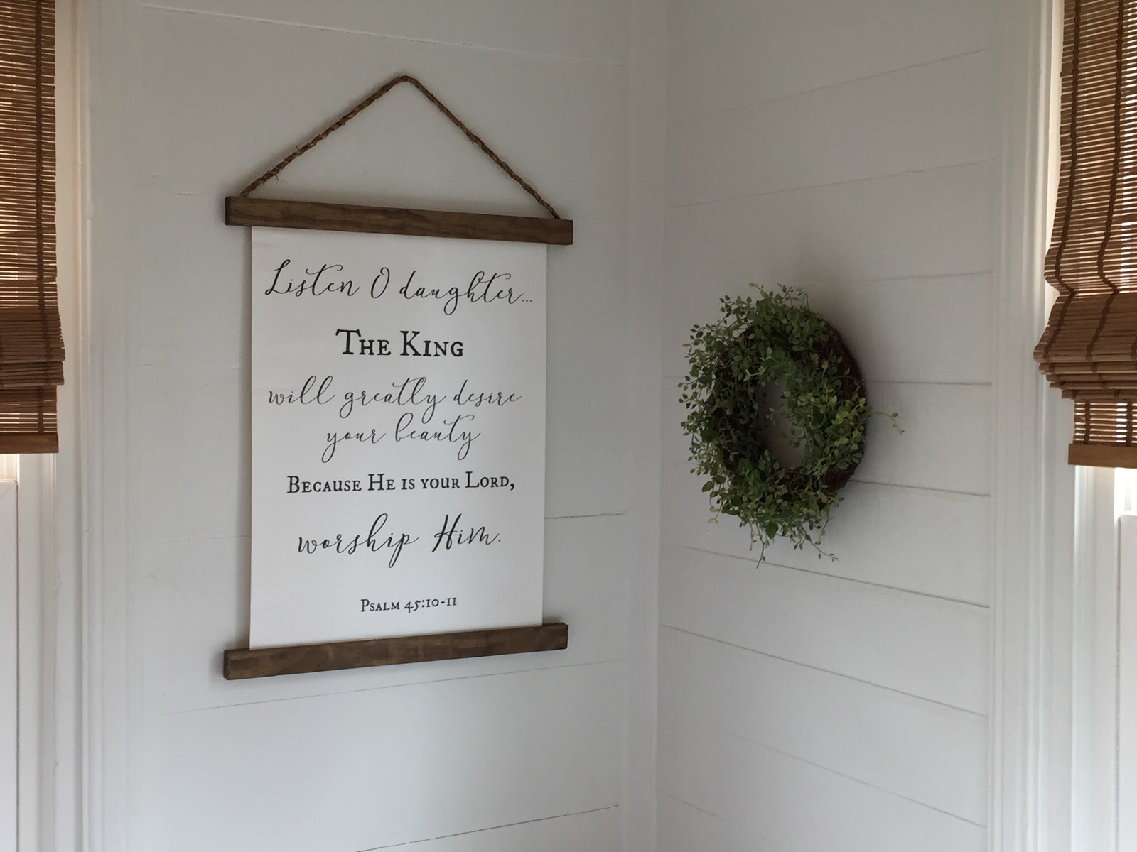 Sorry if you were looking for DIY projects - you know you always get more than those in these posts! I'm sure you're like...whoa, I just wanted to see some shiplap and stuff. So let's bring it down a notch and apply all of that to the home. One way I've reminded myself to sing when the evening comes is by having the Word visible all over my house so that I'm reminded of it's truth all throughout the day. Now, I'm here in the house all day, but maybe it's your car, your office, at the top of your planner, a bracelet, the background on your phone (I realized I may have lost you millennial when I said planner earlier, so I threw a tech gadget in. You're welcome.) The Bible says in Deuteronomy 11:18-20, "Fix these words of mine in your hearts and minds; tie them as symbols on your hands and bind them on your foreheads. Teach them to your children, talking about them when you sit at home and when you walk along the road, when you lie down and when you get up. Write them on the doorframes of your houses and on your gates.."